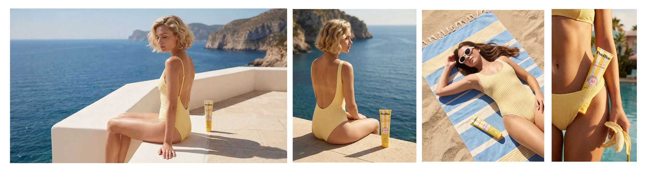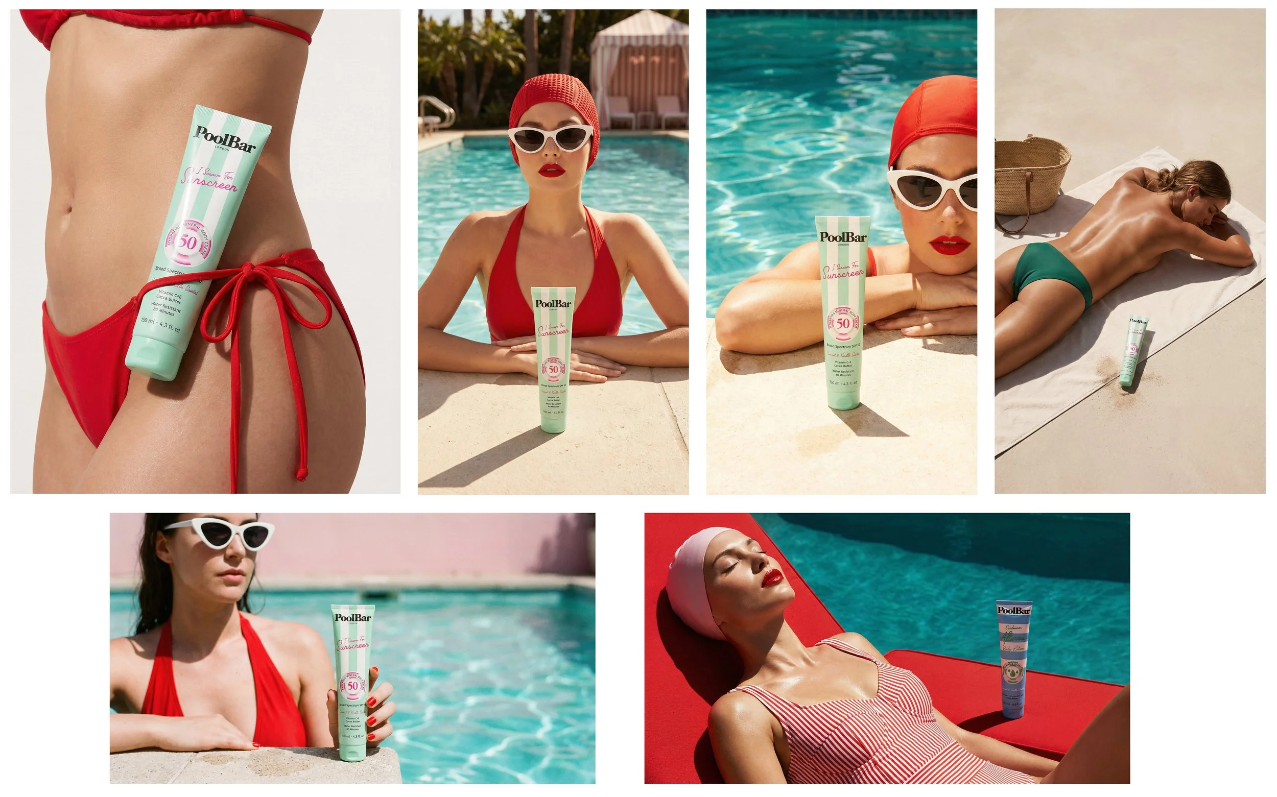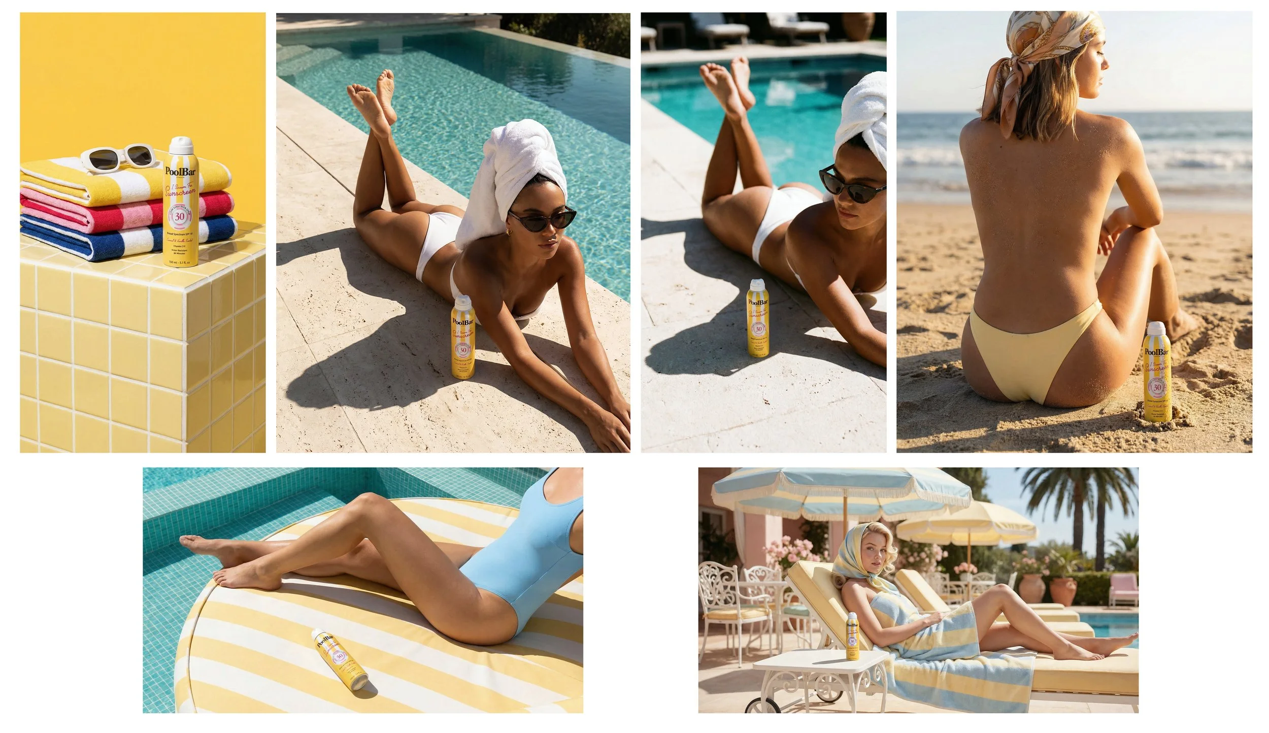 PoolBar London’s brand aesthetic is defined by sunlit nostalgia, graphic stripes, and a polished retro-resort sensibility. Supporting imagery leans into saturated yet soft coastal tones; butter yellow, mint, sky blue, coral, and creamy neutrals - paired with crisp whites and bold accent reds. The visual language balances playful femininity with refined minimalism: clean compositions, strong directional sunlight, sculpted shadows, and tactile surfaces like tiles, towels, and sun-warmed skin. Stripes are a recurring motif across packaging and environments, reinforcing brand recognition while evoking classic European pool culture. Overall, the style feels aspirational yet effortless: premium, summery, and confidently graphic.
